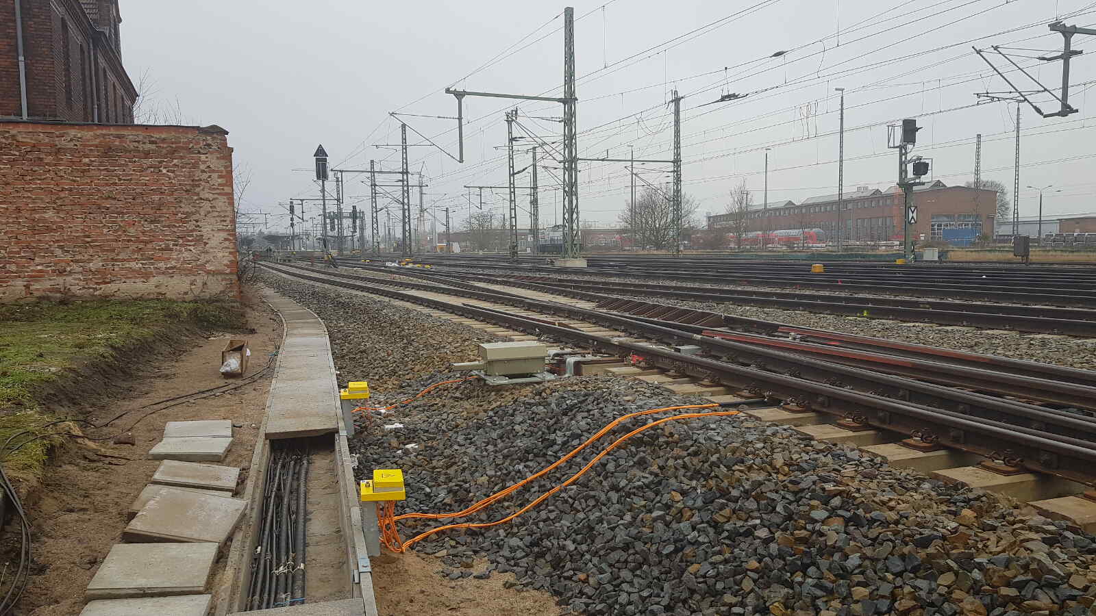 Zuletzt werfen wir noch einen Blick auf die neue östliche Einbindung der Industrie- und Hafenbahn Wittenberge. Hier wurde ein weiteres Gütergleis und eine Weichenverbindung in die Streckengleise aus und in Richtung Berlin geschaffen. Das schafft unter anderem eine deutliche Vereinfachung der Abfertigung der im Wittenberger Hafen gebildeten Containerzüge. Auch hier wird noch an den elektrischen Anschlüssen der Weichen und Signale sowie der Installation der Oberleitung gearbeitet.