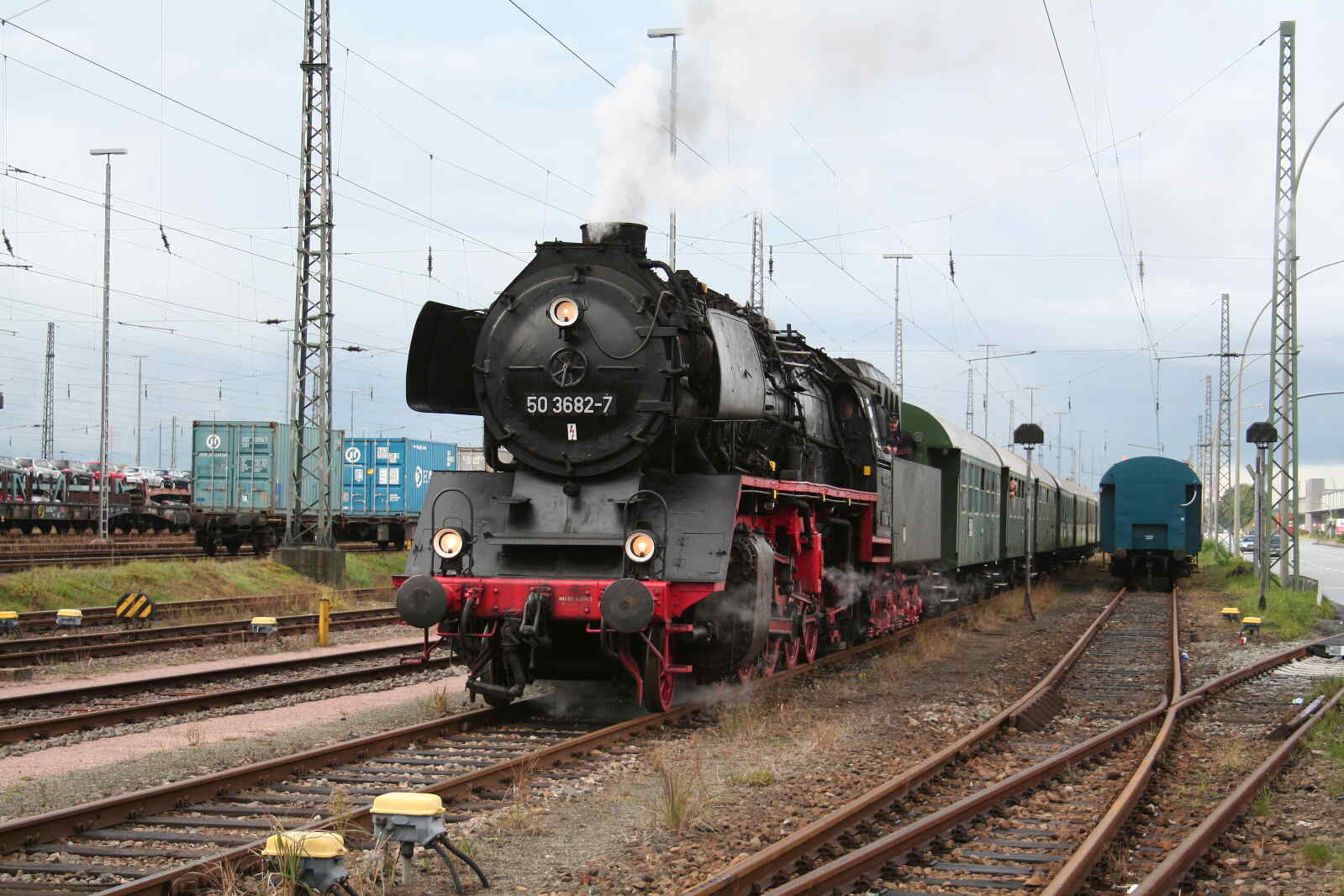 Zu den genannten 208 Exemplaren gehört auch unsere 50 3682, die 1939 bei Krauss-Maffei in München gebaut und von der Deutschen Reichsbahn als 50 255 in Betrieb genommen wurde. Sie hatte ein bewegtes Leben. So wurde sie von 1948 bis 1952 im sogenannten Kolonnendienst eingesetzt. Dabei wurden Maschinen und Güter aller Art, die von der Sowjetunion als Reparationsleistungen nach dem Krieg beansprucht wurden, bis an die polnisch/russische Grenze gefahren, wo sie in Güterzüge mit russischer Breitspur umgeladen wurden. Solche Fuhren dauerten mitunter Wochen.