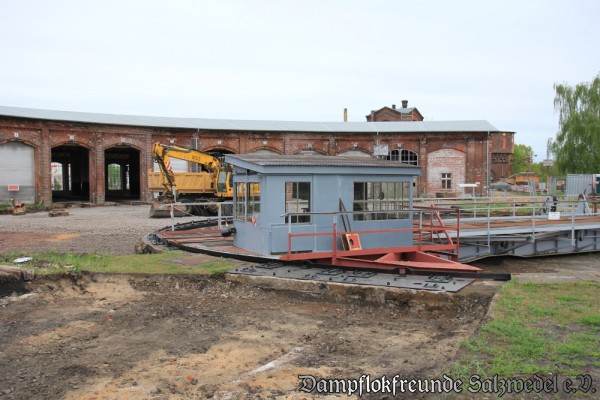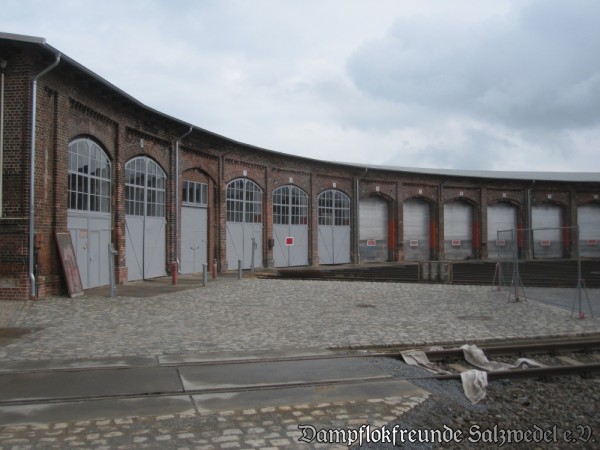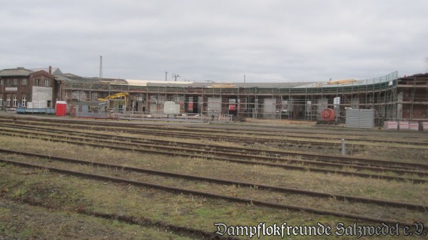 Inzwischen haben die Bauarbeiten im Bereich der Lokschuppen II und III des ehemaligen Bw Wittenberge begonnen: