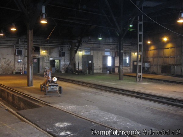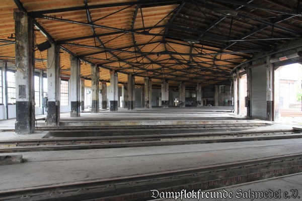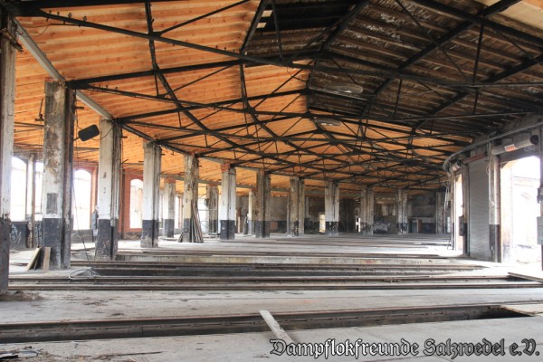 Darüber hinaus wurden die Rolltore, soweit derzeit möglich, geöffnet, um den Baumaschinen Platz zum Manövrieren zu schaffen. Im Schuppen wurde die alte Waschanlage nebst Heizrohren abgebaut und es wurde damit begonnen, das baufällige Dach sowie einen Anbau im Bereich des ehemaligen Schuppens I abzutragen.
