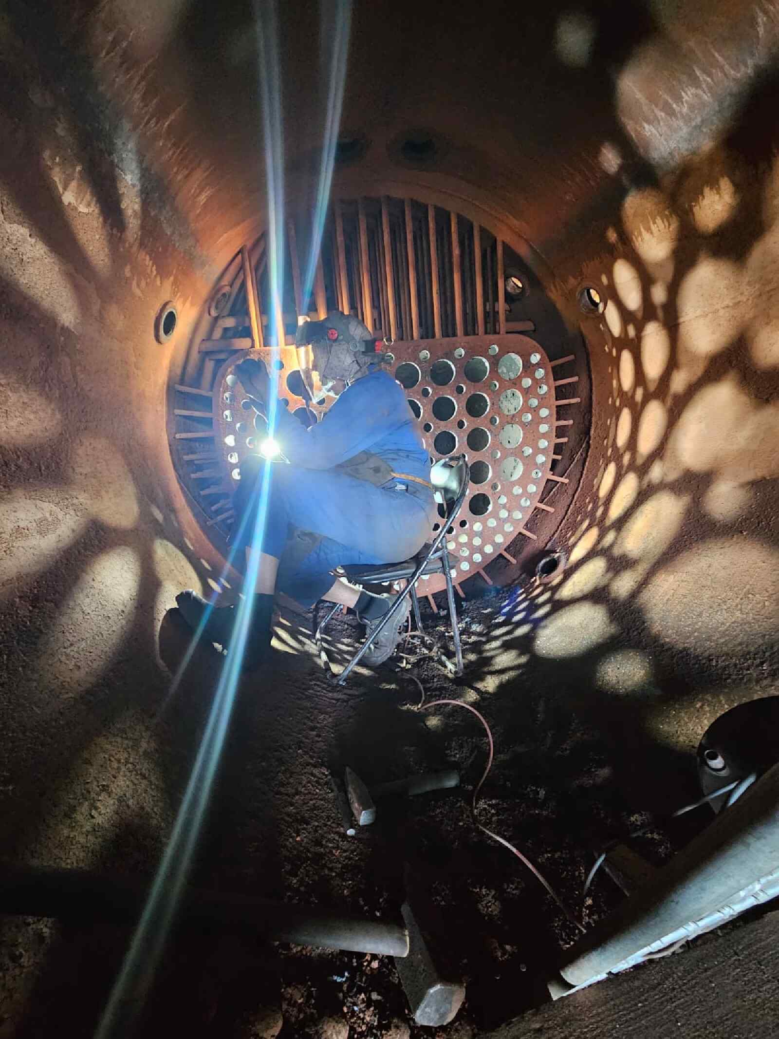 Unsere eigene Dampflok 50 3570 befindet sich gerade noch „in Behandlung“. Ihr wurden ja – wir berichteten schon darüber – alle Rohre aus dem Kessel gezogen, damit sie durch neue ersetzt werden können. Inzwischen hat die Kesselinstandsetzung weitere Fortschritte gemacht. Hier wurden die Rohrwände geschliffen. Das sind die metallenen Wände im Kessel, zwischen denen die Rohre verlaufen. Die Öffnungen, welche die Rohre aufnehmen, müssen tatsächlich kreisrund sein, damit die neuen Rohre tatsächlich druckdicht eingebaut werden können.
